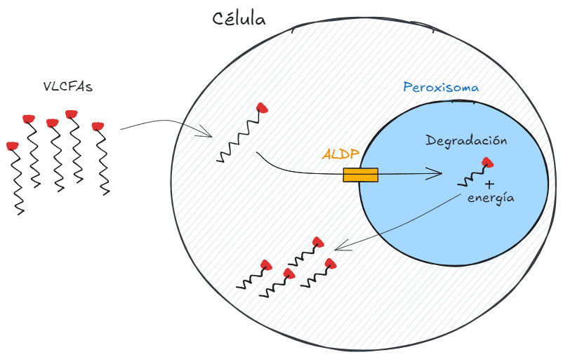Centrándonos en los VLCFAs, estos deben ser importados al peroxisoma a través de transportadores especializados como ALDP. Así, los VLCFAs entran en el peroxisoma, son degradados para obtener energía y ácidos grasos más pequeños, y pueden ser exportados del peroxisoma hacia otras rutas metabólicas.