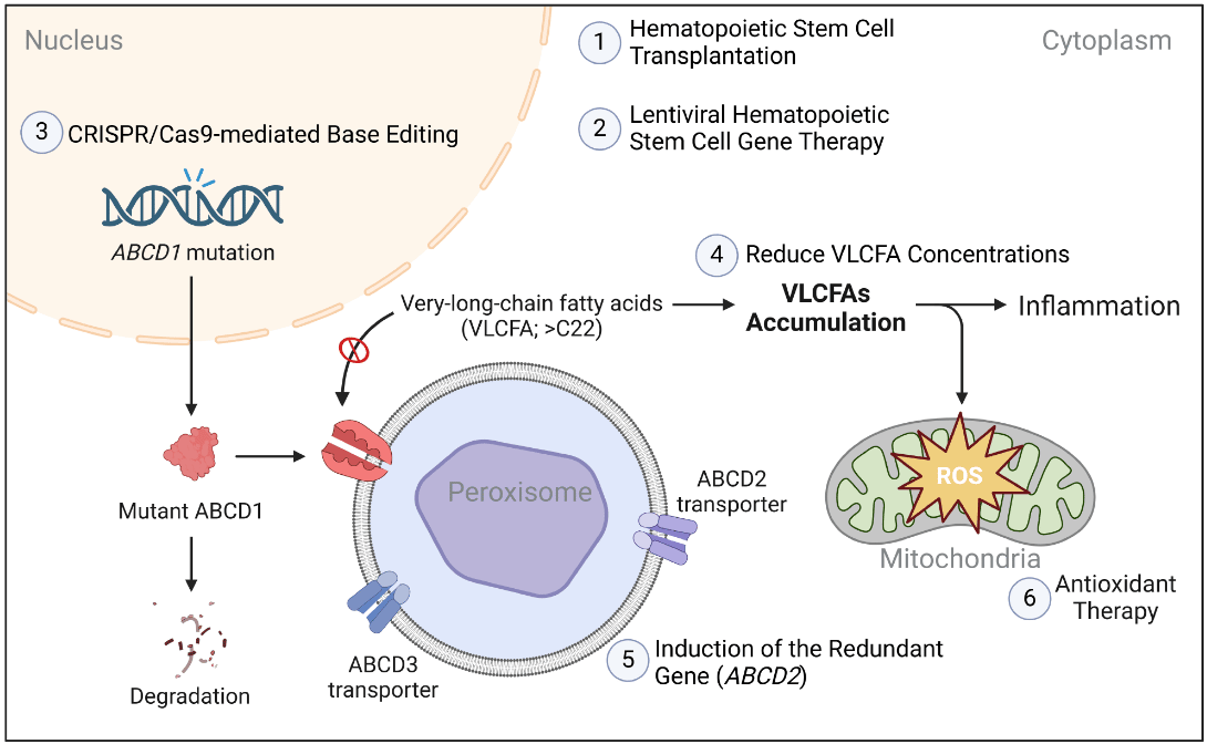 Los tratamientos aprobados y en desarrollo para estos subtipos de X-ALD se agrupan en varias estrategias: