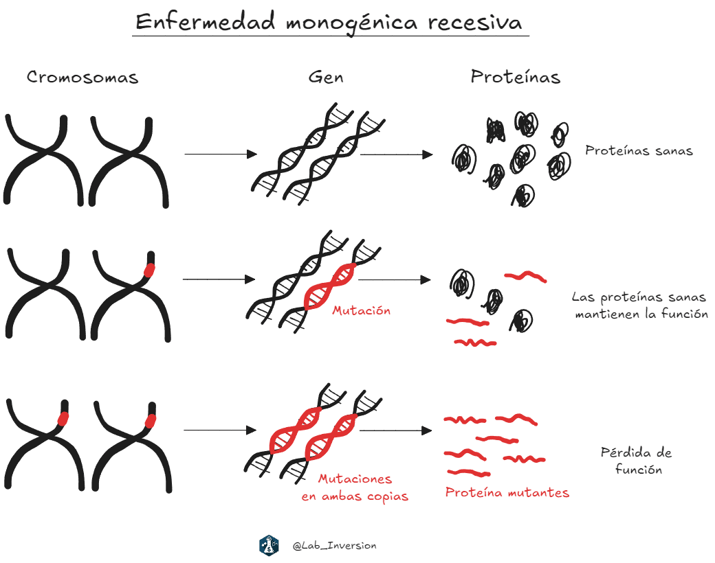 En otros casos, tener una única copia sana del gen es suficiente para que no se pierda la función ni aparezca ninguna enfermedad. Cuando esto ocurre, decimos que la herencia es "recesiva", porque se necesita que las dos copias del gen estén enfermas para que se produzca la enfermedad.