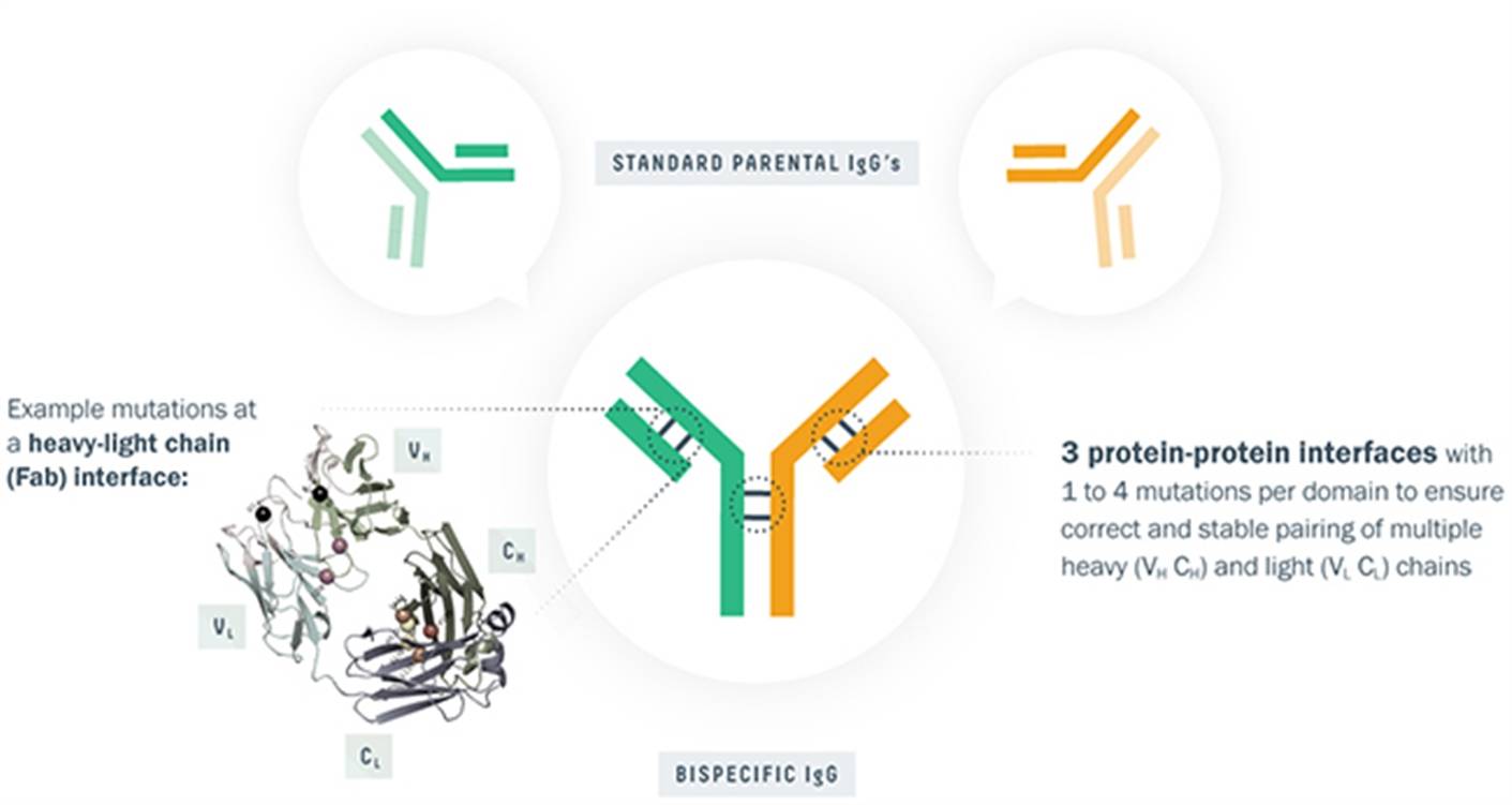 Para evitar combinaciones de cadenas de anticuerpo aberrantes, OrthoMab optimiza las regiones de unión entre cadenas insertando pequeñas mutaciones en el diseño de las mismas. Estas mutaciones dirigidas tienen como finalidad hacer que las cadenas A tengan más afinidad entre sí que por las cadenas B, y viceversa. El resultado: anticuerpos correctamente emparejados y un mayor rendimiento en su proceso de fabricación.