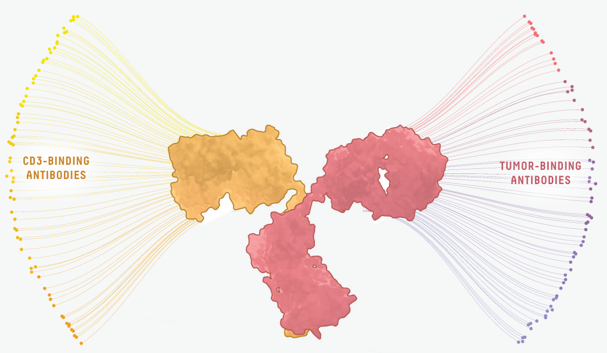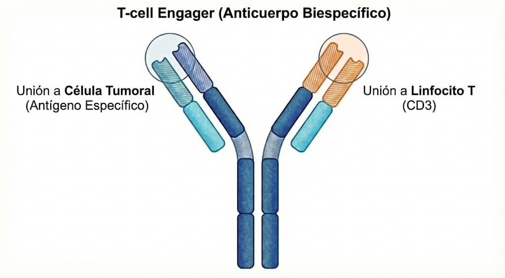El segundo área en la que trabaja Abcellera, los activadores de linfocitos T o T-Cell Engagers (TCEs) son anticuerpos biespecíficos que unen un linfocito T citotóxico a una célula diana que queremos eliminar. Imagina estos anticuerpos como unas esposas de policía: