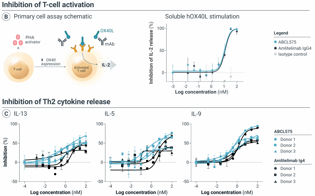En estos experimentos se observó que ABCL575 podía unirse a OX40L, inhibir su unión a OX40, y reducir la activación de linfocitos T de manera similar a Amlitelimab: