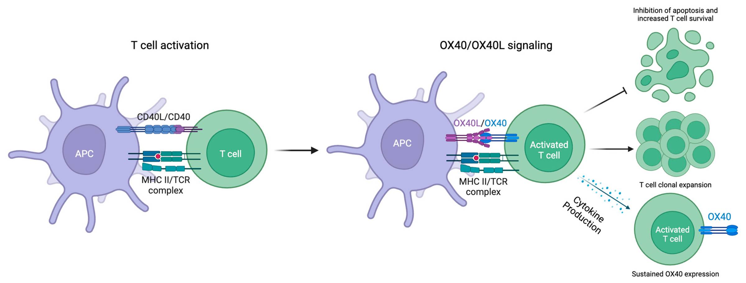 Sin embargo, si la amenaza sigue presente en el cuerpo durante varios días, las células presentadoras de antígeno comienzan a expresar OX40L. Esta es una señal de que la amenaza es persistente y se requiere una mayor activación del sistema inmune. Cuando OX40L interacciona con el receptor OX40 del linfocito T, induce señales de supervivencia y proliferación en él para animarle a que acabe con la amenaza. Es decir, vuelve mucho más potente la reacción de los linfocitos T.
