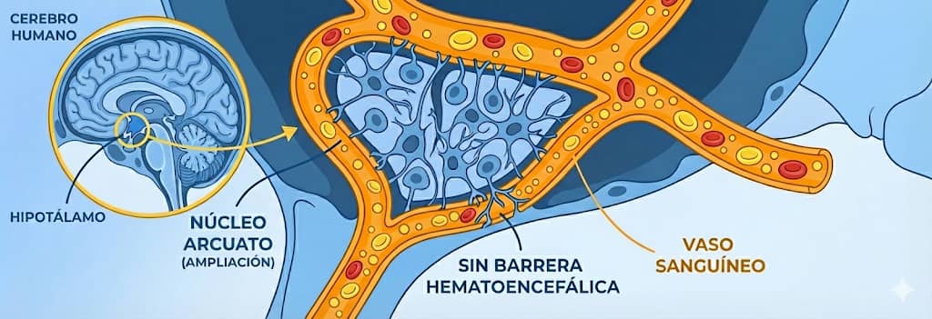 Esquema representativo de la posición del núcleo arcuato dentro del hipotálamo y el cerebro, y su gran irrigación sanguínea.