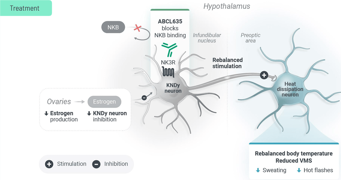 Abcellera va a por lo segundo con ABCL635: diseñar un anticuerpo que se una al receptor NK3R y lo bloquee para evitar que se pueda unir la neurokinina B. Si reducimos su grado de activación, reducimos la actividad de la neurona KNDy y eliminamos los sofocos.