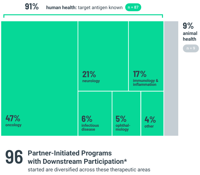 Abcellera tiene una pipeline de anticuerpos en desarrollo muy diversificada — especialmente en los programas de colaboración. Hasta el momento han desarrollado 96 programas a lo largo de su historia, de los cuales la mitad se centra en oncología por el creciente interés de estas terapias.