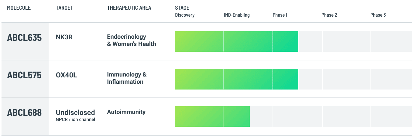 ABCL635 ha recibido aprobación IND (lo cual ya es un pequeño avance en sí mismo) y está actualmente en desarrollo clínico en fase 1 (NCT07118891).