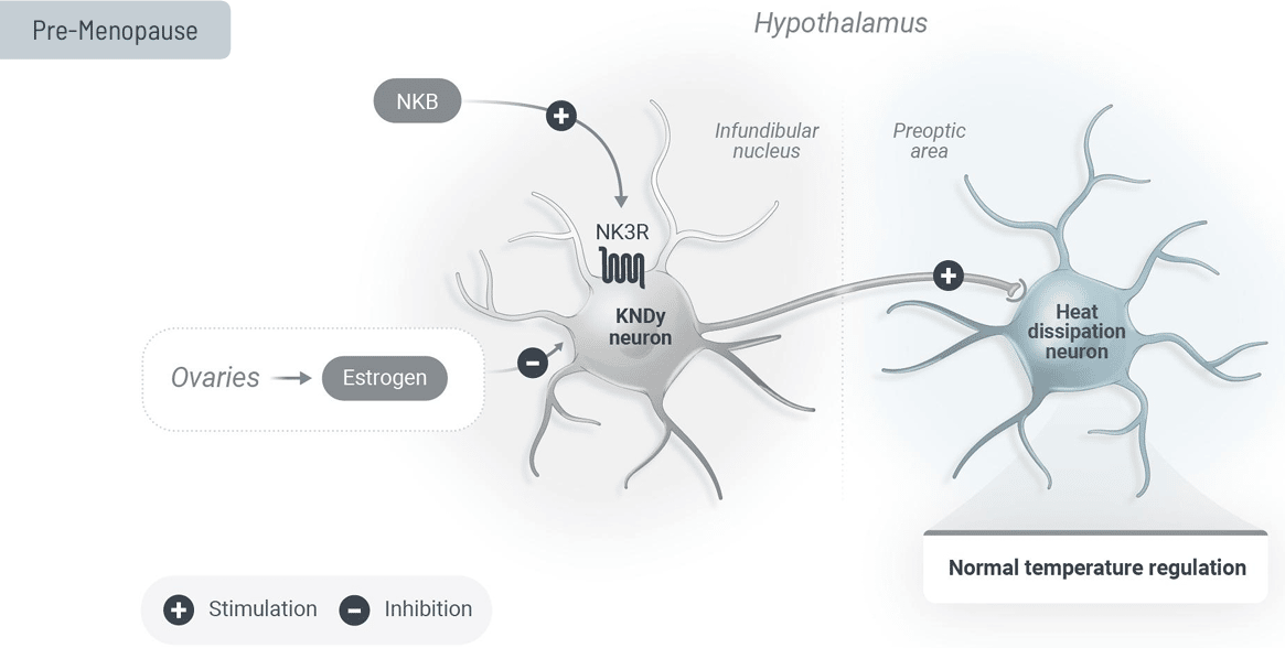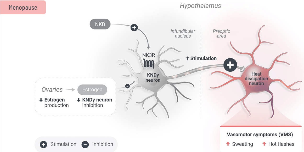 En una mujer con menopausia, la liberación de estrógenos por parte de los ovarios cae en picado de manera crónica. Esta falta de estrógenos permite que la NKB active más a la neurona KNDy, la cual transmite la señal hacia la neurona disipadora de calor. La neurona disipadora de calor a su vez envía señales para inducir la sudoración y la sensación de calor. No es una respuesta frente a un cambio real en el organismo, sino un desajuste por una hiperactivación de la neurona KNDy que tiene como consecuencia la aparición del sofoco.