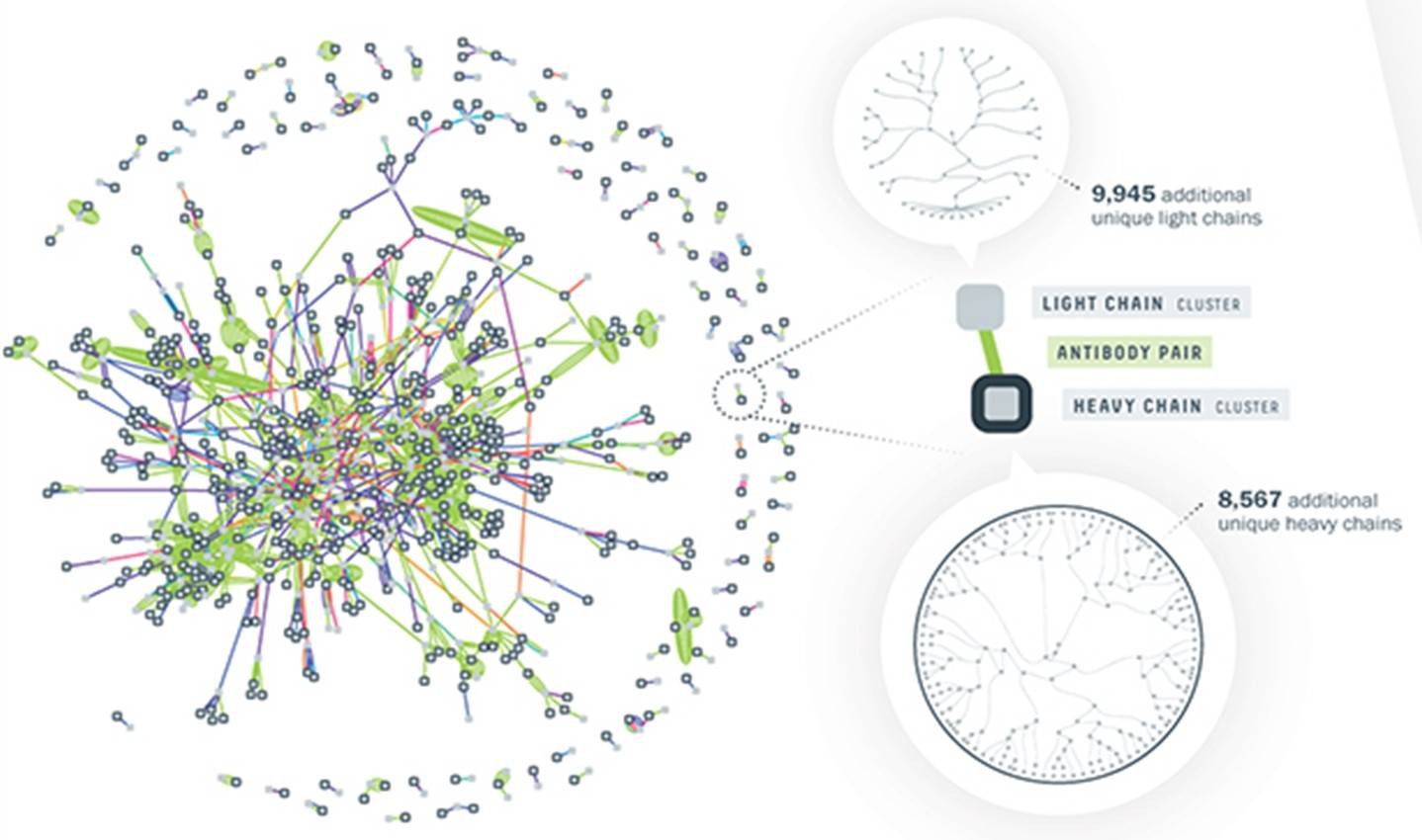 Así pues, Abcellera carga los linfocitos en el chip, valida funcionalmente sus anticuerpos y usa los mejores que haya encontrado como una semilla sobre la que superponer los datos de los demás linfocitos secuenciados. De esta manera, se pueden reconstruir árboles genealógicos derivados de ese anticuerpo candidato, y en vez de tener un único anticuerpo, tener una familia de anticuerpos con propiedades muy similares. El anticuerpo analizado en el chip es quien nos da la pista de que hay un buen candidato, pero disponer de sus parientes relativos nos permite realizar estudios posteriores para ver si alguno de ellos podría ser incluso mejor.