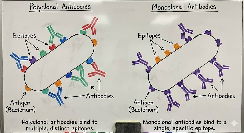 El hecho es que un linfocito B no puede “forzar” generar anticuerpos muy específicos y afines. Cuando aparece un antígeno, millones de linfocitos B generan anticuerpos de forma aleatoria. De toda esa mezcla de anticuerpos policlonales, habrá alguno que sea perfecto para reconocer ese antígeno y neutralizar la amenaza, y los demás tendrán una afinidad intermedia o nula. Lo bueno es que gracias a los avances tecnológicos, ahora contamos con estrategias para identificar ese anticuerpo perfecto y aislar al linfocito B que lo generó, de forma que podamos producir anticuerpos monoclonales, que provienen de un único clon de linfocito B, para identificar ese antígeno.