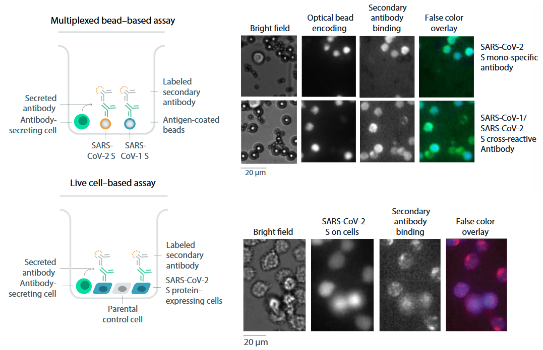 Aislamos sus linfocitos B y los pasamos al chip de microfluídica para comenzar a caracterizar sus anticuerpos. En total, se analizan 5.8 millones de células. Los estudios funcionales consisten en dos tests que emiten una señal fluorescente cuando los anticuerpos generados por un linfocito se unen a espículas virales añadidas al medio.