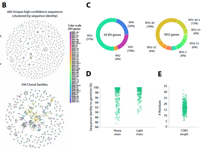 Se encuentran 440 anticuerpos con alta fidelidad pertenecientes a 394 familias de clones distintos. Se emplea Celium para seleccionar 187 anticuerpos candidatos, basándose en propiedades como diversidad de secuencias, solubilidad, etc. La idea fue seleccionar todos los anticuerpos que fueran lo más diversos entre sí pero que todos tuvieran capacidad de unirse a la espícula del virus.