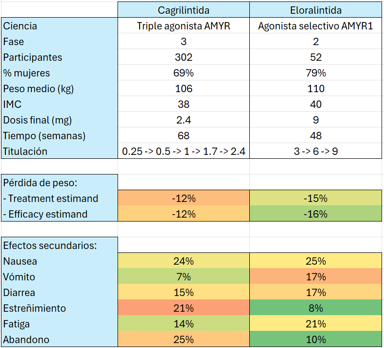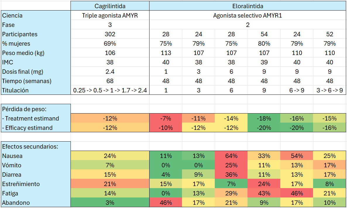Cagrilintida ya ha pasado ensayos de fase 3, mientras que Eloralintida está realizando esos ensayos ahora mismo. Los datos disponibles son de la fase 2.