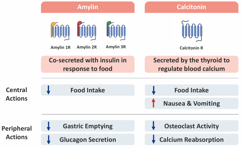 Cagrilintida y eloralintida son dos casos de análogos de amilina que tratan de activar los AMYRs de manera selectiva frente al receptor de calcitonina, un receptor hermano muy parecido que produce náuseas y vómitos.