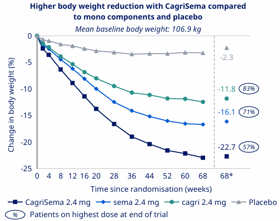 ¿Resultado? Sólo el 83% de los pacientes completaron el ensayo recibiendo la dosis más alta de cagrilintida, algo que también jugó a la contra del dato medio de pérdida de peso que obtenemos.