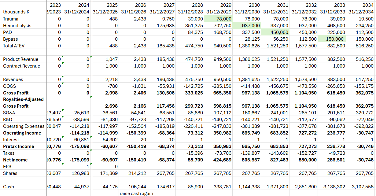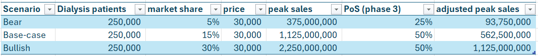 Los datos dicen que la incidencia es ligeramente superior en mujeres que en hombres, pero vamos a asumir 50/50 por simplicidad. Basándonos en los datos y en la dirección que están llevando los ensayos clínicos, no parece que los hombres vayan a utilizar mucho esta opción frente a la fístula AV que les funciona mejor. La población objetivo son las mujeres, unas 250 k pacientes. De aquí podemos asumir distintas tasas de adopción que afectarían a las ventas, pero no es razonable pensar que vaya a ganar un 50 % de cuota de mercado.