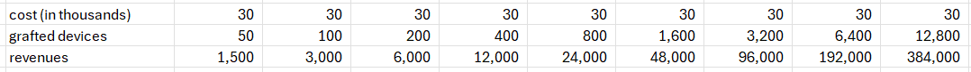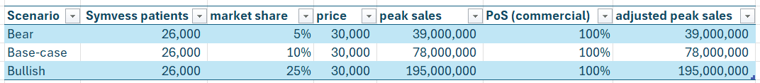 - Normalmente aplico un crecimiento sigmoide a las ventas de cada producto a lo largo de 3-5 años. Lo típico es que al principio el producto crezca lentamente hasta que los médicos se sienten cómodos usándolos, y entonces la adopción se dispara hasta alcanzar el pico de ventas (marcado en verde). Luego el pico suele mantenerse hasta que se pierde la exclusividad de las patentes. Estoy asumiendo que en 2026 serán capaces de generar 2,5 M de las ventas de Symvess, que equivaldría a ~80 dispositivos implantados.