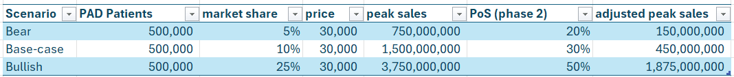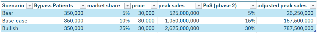 Visto lo ocurrido con Symvess, no parece que el trasplante de vena safena vaya a dejar de ser la opción estándar, por lo que Humacyte tendría que competir en un nivel inferior. Por ello, no creo que aun siendo aprobado vaya a ganar mucha cuota de mercado. Por último, ajustamos por la probabilidad de éxito de los ensayos.