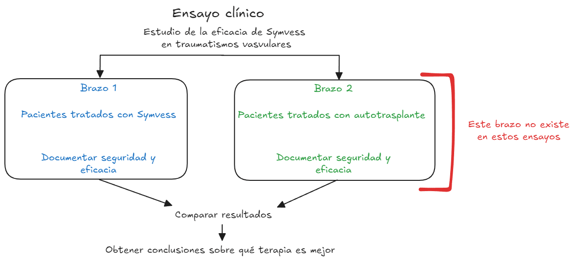 El estudio empleó un sólo brazo, que podría ser criticable. En general, los ensayos ideales son aquellos en los que se comparan dos tratamientos. Es decir, podrían haber intervenido a la mitad de los pacientes con Symvess y a la otra mitad con otra técnica (autotrasplante, polímero sintético, etc) para comparar cual es mejor. Es cierto que en situaciones de emergencia como los traumas se puede hacer la vista gorda por la inminencia del problema y porque a veces no existe una alternativa a mano, pero sigue siendo importante incorporar estos brazos siempre que se pueda para tener una comparativa más fiable.