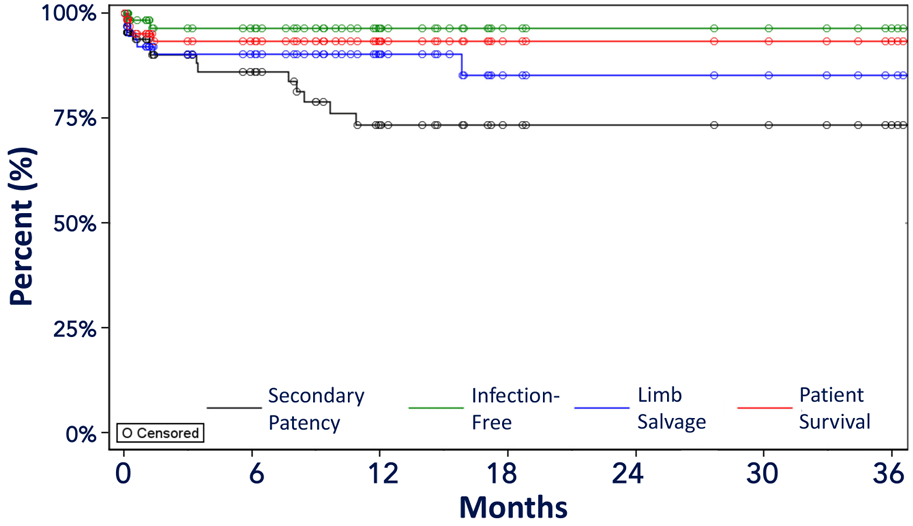 De los 17 soldados atendidos, el 100 % se mantuvo sin infecciones ni amputaciones durante aproximadamente 6 meses, mientras que la patencia secundaria media fue del 87 %. Remarco "media" porque los intervalos del 95 % de confianza de esa media oscilan entre 42,5-97,8. No obstante, es un ensayo que aporta unos datos muy buenos.