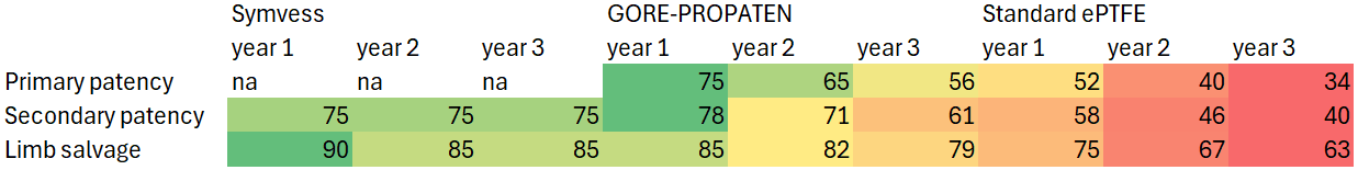 Como no han hecho ensayos clínicos con varios brazos, hacen otra comparación con bases de datos que registran a pacientes con autotrasplantes (de sus propias venas, autologous vein). Los pacientes se compararon por tipo de arteria afectada y severidad y se analizó lo mismo que en el anterior: patencia, amputación, etc):
