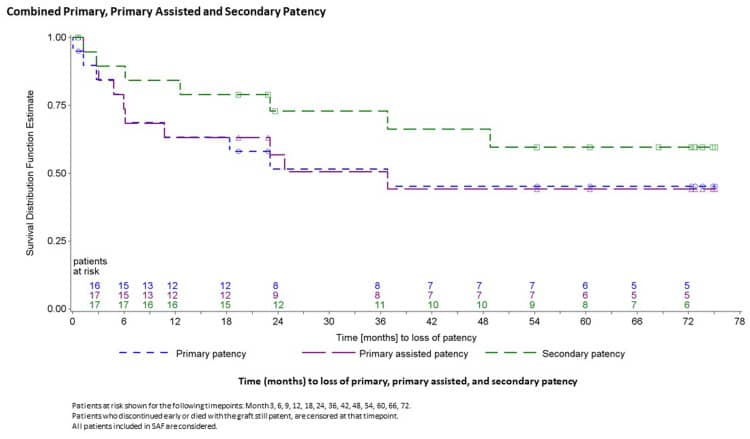 Patency o patencia: es el tiempo que dura el vaso sanguíneo abierto, con flujo de sangre, antes de cerrarse. El cierre puede ocurrir por diversas causas (que colapse, que se degrade, que se genere un trombo, etc). Distinguimos dos tipos de patencias: