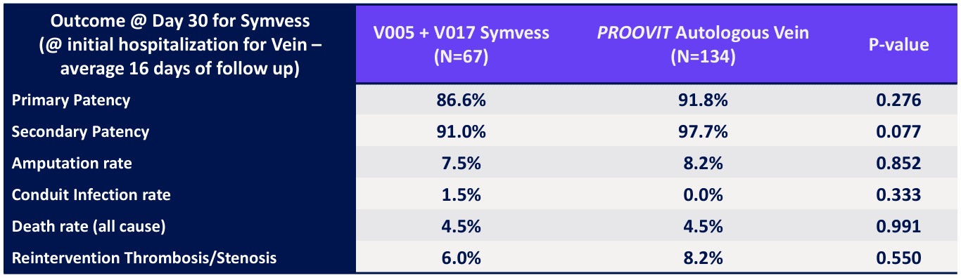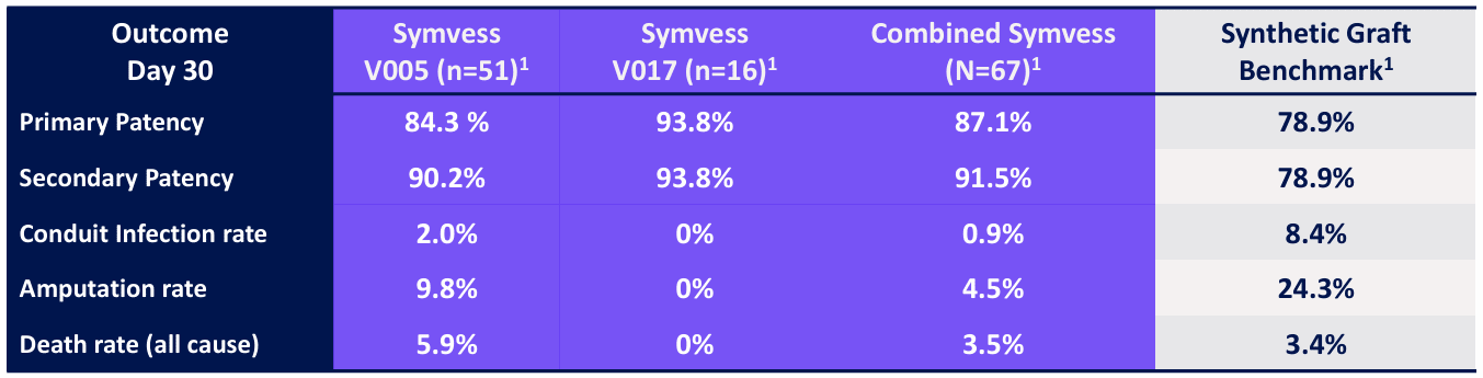Los resultados muestran que en ambos ensayos hay un mayor número de pacientes a los 30 días cuyo Symvess funcionaba en comparación con el sintético. Lo mismo para la patencia secundaria. Por otro lado, Symvess resultó derivar en menos infecciones y ratio de amputación que el sintético también.